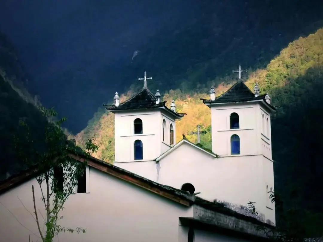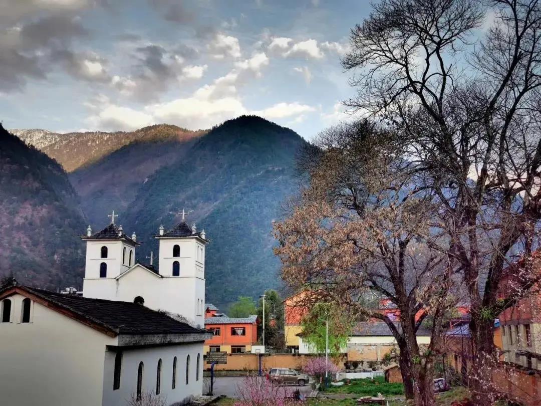 你會(huì)看見白墻拱窗的哥特式尖塔,隱秘在怒江丙中洛這座神秘的花園里,仿佛真的置身于瑞士,教堂,深山,蒼樹是怒江教堂的迷人之處。
