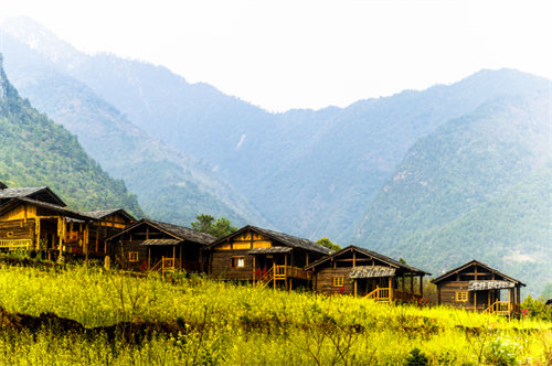 無非是一些低矮的木頭房子,遠遠看過去,一排排,一座座,散布在半山腰,在山腳,在草壩上,卻錯落有致,跟山勢,跟流水,跟野花,融于山水,融于自然,一起構(gòu)成一幅幅優(yōu)美的畫卷。